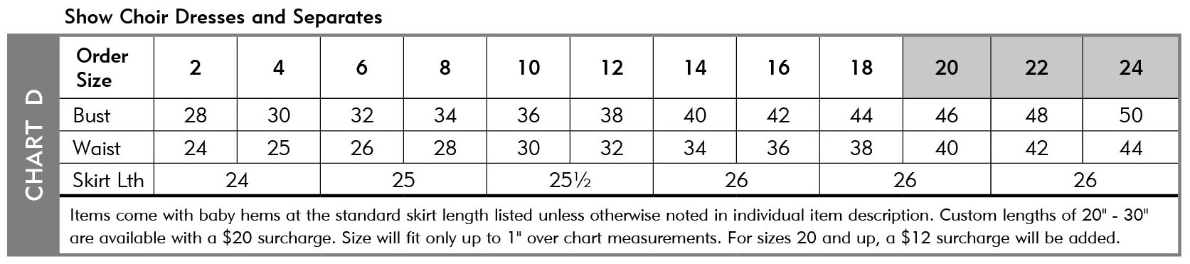Size Chart D Ladies' Show Choir